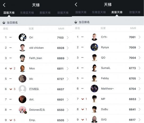 DOTA2新天梯系统登录客户端后,无论是普通玩家、游戏主播还是职业选手都开始争相出分。经过一天的厮杀,各路DOTA2大神均已出分。 从目前的出分状况来看,以前的7000+选手在新天梯出分基本都是超凡入圣五星段位,新出的天梯分以基本不会超过7000。 目前VG战队中单选手Ori以7103分冠绝国服,老鸡和faith_bian紧随其后。相比较国服只有1位7K选手,欧服已经有6位7K选手,奇迹哥则以7226分再次成为全球天梯第一人,不过前天梯第一人Midone由于家里有事,尚未开始冲分。东南亚服则尚未出现7K选手,或许是Abed还没出分吧。 四大服天梯榜单: