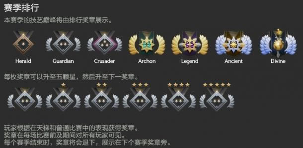 《Dota2》官博公布消息,在今天的更新中重做了天梯匹配系统,首个半年天梯赛季正式开启。新赛季,所有玩家都可以获得个人档案上的天梯奖章,代表当前赛季的最佳成绩。赛季天梯奖章一经获得将不会被降级。初始校准比赛将以原来的水平作为依据。 天梯奖章有七个等级,每个等级需要获得五颗星星才能升至下个等级。这七个等级分别是:先锋、卫士、十字军、执政官、一代传奇、万古流芳和超凡入圣。奖章将取代原来的分数系统。
