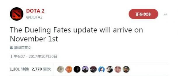 考虑到时差以及以往的更新情况,国内应该是11月2日。只不过V社并没有说是在测试服还是正式服更新。不过考虑到血命之战更新将会加入两名全新英雄,而且此前一直有传言,在游戏性上会有大改,这么大的更新想来应该会是先在测试服放出。 在Ti7赛场上,V社通过预告片的形式公布了《Dota2》两名全新英雄,而且画风上比较可爱。 血命之战更新预告: