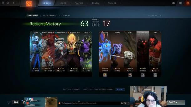 Imaqtpie是美国《英雄联盟》职业选手兼著名的主播,前阵子带着队友开黑玩《Dota2》,作为处女秀,这局可是惨不忍睹。点击观看 第一次玩《Dota2》的Imaqtpie就选了影魔,而且还会卡兵。不过中路对线卡尔,而且对面的lich似乎还经常过来帮忙,一直补不到刀的影魔就有点难受了。自己上下两路的队友也是一开始就崩盘了。整个过程是十分欢乐。中途看了一眼卡尔的技能表,竟然有十个。好吧,Imaqtpie笑着说“还好自己也有六个技能”。 最后的比赛结果是63:17,输掉了比赛,可以说惨不忍睹了。