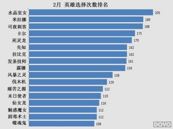 在经过了相对沉寂的2月之后,各大战队在3月又开始在各种比赛中进行较量。据统计,3月各职业战队共进行了639场比赛,较2月份的553场有不小的提高。再看接下来的赛程,这一数字还将继续增加。 3月开始,东西方各重要比赛逐渐开启。不管是西方的StarLadder系列联赛,还是中国的WPC等比赛,都云集着不少顶尖的DOTA2战队,而这也使得本月的热门英雄分析意义非凡。 3月最热门的英雄,像冰魂、狼人、萨满、暗牧等,都已经很久没有出现在CW的舞台上了。这些英雄并非完全是“突然崛起”,从2月份的数据中其实就可以看出些端倪。 选择次数最多的英雄: 2月份选择次数最多的是冰女,而3月份则变成了另一个“冰系”的法师极寒幽魂。冰魂的几个小技能可以和任何英雄进行配合,这使得冰魂能够适应各种不同的套路要求。同2月份相比,榜单上出现了6名“新英雄”,分别为:冰魂、蝙蝠、暗牧、人马、暗影萨满和火猫。2月榜单的前三名里,仅有小强保住了自己第三名的位置。至于之前版本大热的辅助冰女,如今早已难觅踪迹。