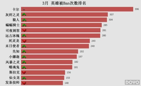 被Ban次数最多的英雄: 从榜当中不难看出,卡尔依旧是大家最讨厌也最害怕看到的英雄之一,已经连续两个月荣登“被Ban最多”榜的第一名。同选择榜单相类似,本月的“被Ban最多”榜中也有6个“新人”,分别为:冰魂、狼人、火猫、小娜迦、小鱼人和仙女龙。其中,火猫的崛起最应该引起大家的关注。在2月份,火猫仅在CW中被Ban35次,如今却直线上升至307次,可见大家都不怎么喜欢看到这么一个赖线难死、团长输出恐怖的英雄出现在自己的对面。