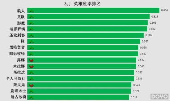 登场次数最多的英雄(被选数+被Ban数): 卡尔这个大家最讨厌的英雄,和冰魂这个大家最喜欢的英雄毫无悬念的登上了这份排行榜的前两位。紧随其后的是先手无解的蝙蝠和伤害恐怖的火猫。同2月份相比,智力型英雄在榜单中的数量又有所增加(从6名上升到了8名),并且还牢牢的掌握着前三的宝座。 胜率最高的英雄(仅针对出场数>50的英雄进行统计): 不明白狼人为什么这么热门的玩家,看看下面这张图就懂了。狼人在3月份的比赛中有着惊人的66%的胜率,一举使其成为DOTA历史上胜率最高的英雄之一。除了狼人之外,另外一个让我们感到惊喜的便是小精灵,其61%的胜率同样不可小觑。不过奇怪的是,登场次数最多的15名英雄中,仅有5名出现在了“胜率榜”里,其中最为热门的卡尔仅仅只有50.5%的胜率。
