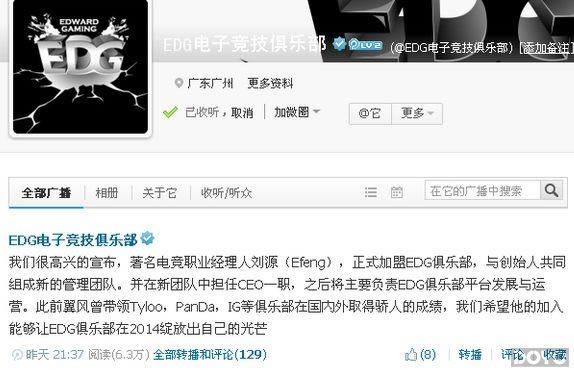 “我们很高兴的宣布,著名电竞职业经理人刘源(Efeng),正式加盟EDG俱乐部,与创始人共同组成新的管理团队。并在新团队中担任CEO一职,之后将主要负责EDG俱乐部平台发展与运营。此前翼风曾带领Tyloo,PanDa,IG等俱乐部在国内外取得骄人的成绩,我们希望他的加入能够让EDG俱乐部在2014绽放出自己的光芒。”
