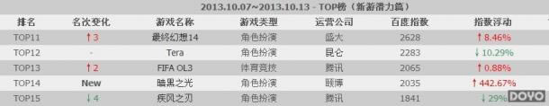 潜力榜方面,《最终幻想14》热度稍涨,由天津颐博公司研发的《暗黑之光》上周开测热度飙升,这次也在我们的新游榜当中小露一面。《疾风之刃》由于长期没有消息,下滑幅度较大。