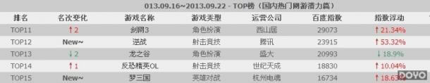 本周潜力榜《逆战》和《梦三国》新晋入榜,取代了上期新入榜的《圣王》和《英雄三国》,看来中秋假期来袭,老游戏还是有很强的人气基础。