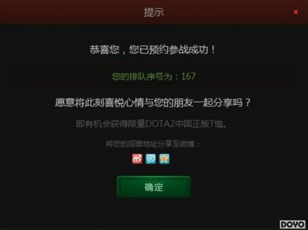 玩家在成功预约参战后获得的排队序号,将根据参与的先后顺序依次进行排列。而今后的激活码发放,也将依照排队序号由低到高的排序,按批次逐步进行。所以,越早预约参战的同学将获得排位更靠前的排队序号,也将更快的获得激活码,参与到DOTA2国服的激战之中。还没有国服体验资格的同学不要犹豫,马上预约吧!