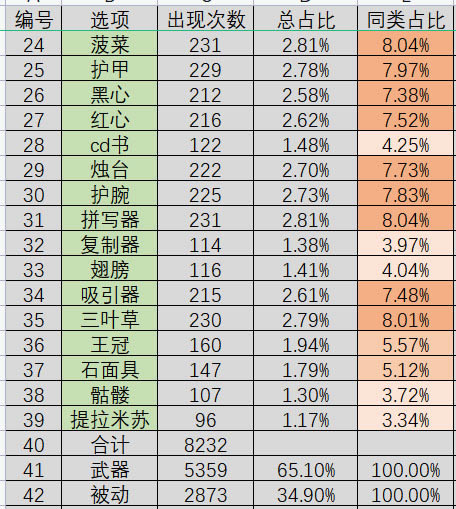 其次是被动篇,总体占比约为35%,出现概率大约分为3个稀有度: 1.非常常见:大于7%:菠菜、护甲、黑心、红心、烛台、护腕、拼写器、吸引器、三叶草 2.常见:大于5%:王冠、石头面具 3.少见:小于5%:空白之书、复制器、翅膀、诅咒骷髅、提拉米苏 以上结果都是1级0幸运时升级得出的数据,暂且不清楚人物等级和幸运是否会影响某些装备的出现概率,留到第二弹再统计吧,有时间会让电脑多挂一会脚本,看看随着样本量扩大,数值会不会更稳定些。 总结一下: 1.武器和被动分别占新装备选项的65%和35%,被动更加稀少,难以收集。 2.在一次升级后获得多个有需求的新装备时,可以考虑先选择更加稀有的装备,方便形成理想配装。 3.装备的稀有度并不一定和强度成正比,但很多强力装备和被动确实很稀有。 4.武器中双枪和黑白鸽真是天坑啊,本来各自的概率都小,还要同时收集才能进化,特别是双枪,还需要获得被动中同样是少见装备的提拉米苏,坑! 5.想特地刷骨头、樱花炸弹和车轮开局的基本是别想了,比出ssr还难,这三件的出现概率很可能会受到幸运的加成,但0幸运时可以视为根本不存在。 本次分享游戏《吸血鬼幸存者》攻略。 本次分享游戏《吸血鬼幸存者》攻略。 |