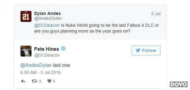 据B社市场经理Pete Hines在Twitter上的答复,“核爆世界”DLC将是《辐射4》的最后一款DLC。