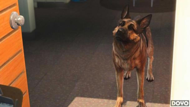 作为一条狗,你拥有两个基本的咬人能力和两个强力攻击技能,一个跳起来咬,另外一个是跑着咬。你可以装备任何狗狗的装备,除非这个装备你不能用。你甚至还可以戴上Pip-Boy,你仍然也可以招募狗肉作为你的跟班。 下面是《辐射4》游戏开场任务狗肉为避难所科技代表开门的画面: