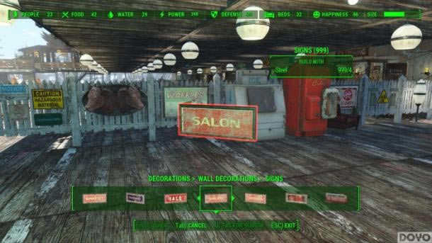 《辐射4》1.4版本中加入了大量的全新标志与装饰,包括酒精,药物,盒子可乐,热狗等等标识,十分醒目。总之玩家可以在家中的任何地方安装这些标识,增加美感。