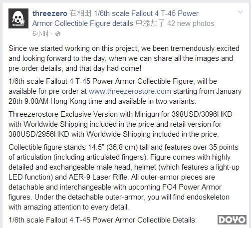 今天香港手办厂商threezero公布了旗下《辐射4》1/6 T45动力装甲的预售,还公布了高达40余张精美的官图,从各个角度给我们展示了手办的精细程度,无奈售价高达398美元,不然小编真是想买买买啊! threezero在FACEBOOK上的公告: