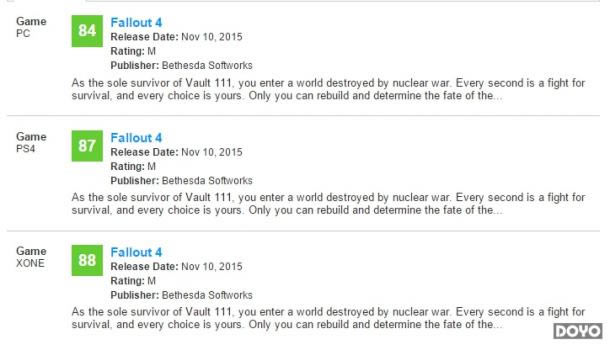 但是我个人认为,这种成功尚不足以让其有资格获得任何GOTY(年度游戏奖)。 先不管其具体的各项品质,先来看看媒体均分: 以metascore为准,三平台均未过90分,而《巫师3》的三平台评分均高于90分,更要命的是用户评分,辐射4和巫师3的用户评分的确都比媒体均分要低,但是差别是,同样都按照百分制的话,巫师3的三平台用户评分和媒体评分最大差距也就4分,而辐射4则没有一个平台低于20分,PC版相差甚至30分。 这或许不说明游戏具体的品质,但至少说明,巫师3的评分,在玩家心目中,算是实至名归,而辐射4,则是名不副实。