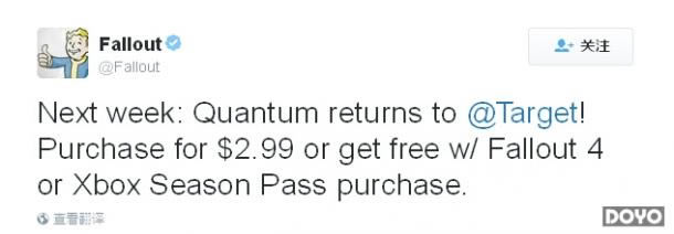 不过,Bethesda近日宣布将会在本周推出第二批核子可乐饮料,仍然在Target独家销售。售价为每瓶2.99美元,不过如果你购买《辐射4》或者季票的话,将可以免费获得一瓶。