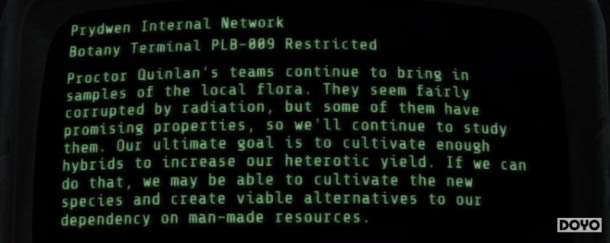 如果玩家加入钢铁兄弟会的话,或许就会发现这个秘密,不过对于其他玩家,首先呢,先得把剧情推进到登上钢铁兄弟会飞艇的任务中才行。 在飞艇的研究中心,玩家可以看到许多不同的动物,蔬菜,植物等等。大多数物种玩家都可以在废土世界遇到,不过却有一个例外: