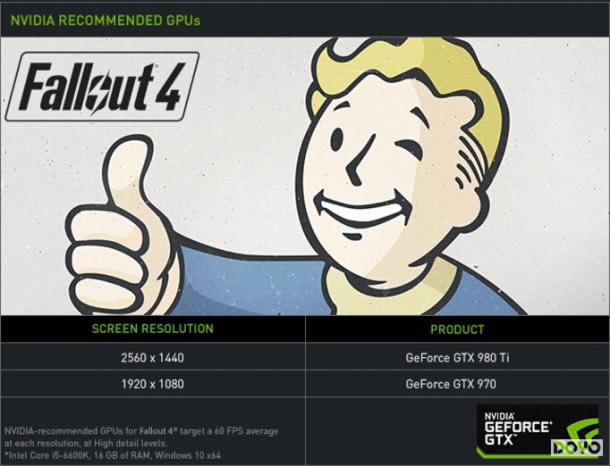 每年的11月是3A游戏喷发的一月,今天NVIDIA又发布了一个新的驱动,优化《辐射4》、《星球大战:前线》和《星际争霸2:虚空之遗》,版本是358.91。 此外NVIDIA官网还发布了一个《辐射4》快速图形指南,根据不同分辨率推荐不同的N卡。 NV表示《辐射4》官方最低配置是GTX 550Ti,2GB显存,只能满足在1280x960的分辨率下实现30fps,而推荐配置是3GB显存的GTX 780.但是这两个上世代的显卡现在都不生产了,因此如果玩家想要为《辐射4》新装一台机器,或者是升级现有的配置,该配什么样的GeForce GTX显卡才能保证高画质设定下稳定60帧呢? 根据NV官方的综合测试,GTX 970是最佳显卡。 如下图所示,在1920x1080分辨率下,推荐显卡是GTX 970,而在2560x1440 2K分辨率下,NV推荐的是GTX 980Ti显卡。