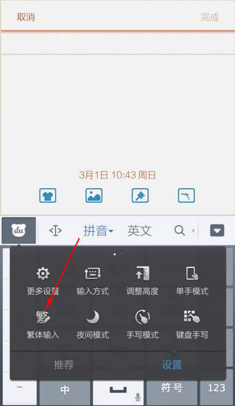 软件是一系列按照特定顺序组织的计算机数据和指令的集合。一般来讲软件被划分为编程语言、系统软件、应用软件和介于这两者之间的中间件。硬件是“计算机硬件”的简称。与“软件”相对,电子计算机系统中所有实体部件和设备的统称。 繁体字有时候我们也会用到,不过平常打习惯了简体字如何使用百度输入法打繁体字呢?可能因为某些特殊场景,比如学术需要,我们会需要输入繁体字,不过一些手机百度输入法的用户可能不知道怎么打繁体字,下面就来介绍一下操作方法。 1.点击手机百度输入法左上角【du】;