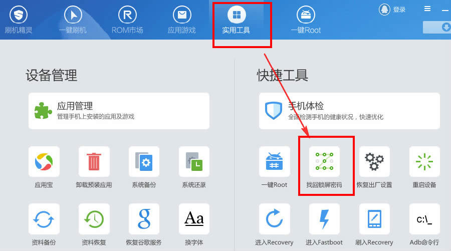 软件是一系列按照特定顺序组织的计算机数据和指令的集合。一般来讲软件被划分为编程语言、系统软件、应用软件和介于这两者之间的中间件。硬件是“计算机硬件”的简称。与“软件”相对,电子计算机系统中所有实体部件和设备的统称。 现如今,常常为我们的手机锁屏设置开锁密码,而手机解锁图案设置太过复杂,容易忘记。这个时候我们就需要一个解锁工具,刷机精灵是怎么解锁的? 1、下载好刷机精灵。在打开链接手机,链接成功之后在刷机精灵页面里面可以看到“实用工具”的选项。