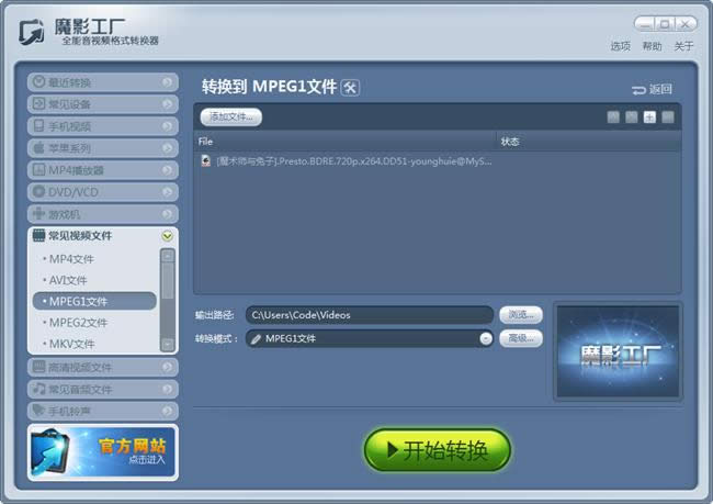 魔影工厂的视频格式转换器,支持手机视频、音频、视频等多种格式。常见视频文件MPEG1、MPEG2格式,该如何进行转换,使用魔影工厂,快速搞定。请点击主界面上的常见视频文件按钮,然后选中下列的“MPE