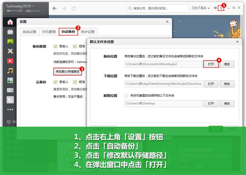 在豌豆荚与手机连接成功之后,在豌豆荚上就可以管理短信信息,那么如何群发短信?如何取消短信的默认弹出?这两个问题,我们一一来看看它们的解决方法。如何取消短信的默认弹出?STEP 1:单击豌豆荚右上角「设置」按钮,点击「桌