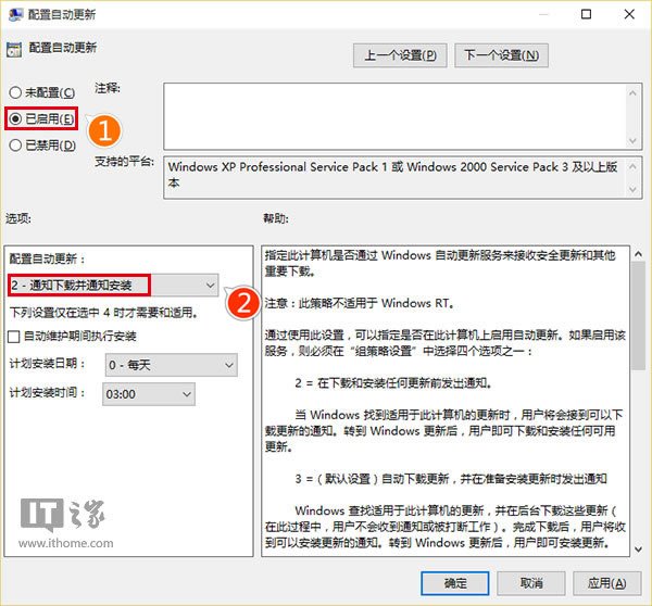 在Win10专业版以上的系统中,用户可以通过组策略来设置手动下载和安装更新的方式,在Cortana搜索栏中中输入“组策略”后按回车键,找到计算机配置→管理模板→Windows组件→Windows更新,按照上图的方法进行设置即可。Win10家庭版用户则需要通过手动开关更新服务的方式来控制更新过程。