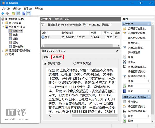 Windows 10是美国微软公司研发的跨平台及设备应用的操作系统。是微软发布的最后一个独立Windows版本。Windows 10共有7个发行版本,分别面向不同用户和设备。2014年10月1日,微软在旧金山召开新品发布会,对外展示了新一代Windows操作系统,将它命名为“Windows 10”,新系统的名称跳过了这个数字“9”。截止至2018年3月7日,Windows 10正式版已更新至秋季创意者10.0.16299.309版本,预览版已更新至春季创意者10.0.17120版本 在Win8.1/Win10中,磁盘检查详细信息并不像Win7及以前系统那样在过程中直接给出,这使得某些专业用户很难直接了解检查结果。微软这样安排可能和更新日志详细内容不面向普通用户开放一样,为大多数用户“减轻负担”。不过,如果你的确需要查看这些日志,可以到“事件查看器”中进行搜寻,而且并不麻烦。 具体方法如下: 1、在Cortana搜索栏输入“事件查看器”后回车,或者在开始按钮点右键,选择“事件查看器” 2、在左边栏展开“Windows日志”,选择“应用程序”,从右边栏选择“筛选当前日志”,如下图——