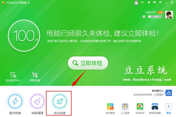 1、遇到升级到Win10后 SQL软件开机报错,解决步骤非常简单,网友只需要打开360安全卫士,打开360安全卫士,找到界面左下方的“优化加速”