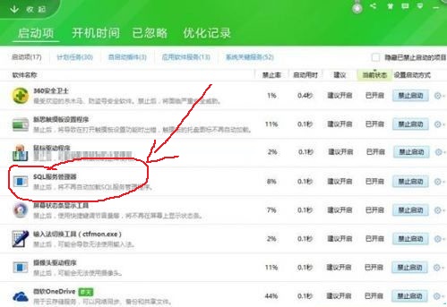 3、下面在“启动项”中,找到 SQL服务管理器,右边点击“禁用”。