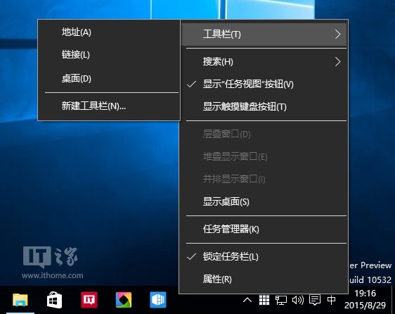 ▲未显示的任务栏图标:控制面板的系统、软媒魔方、软件管家、IT之家 而且这个界面有时候会出现Bug。如上图所示,超级菜单在弹出二级菜单的时候,某些Win32应用固定在开始菜单的快捷方式会暂时消失,取消菜单显示后恢复正常。这一现象并不会每次都出现,因此很难确定出现的原因,可能和某些打开的窗口组合有关。 除此之外,首次启用“显示开始菜单、任务栏和操作中心的颜色”后,选中窗口标题栏会显示为黑色。不过在尝试改变桌面后,配色又会恢复为当前壁纸主色调,而且以后不能恢复为黑色。