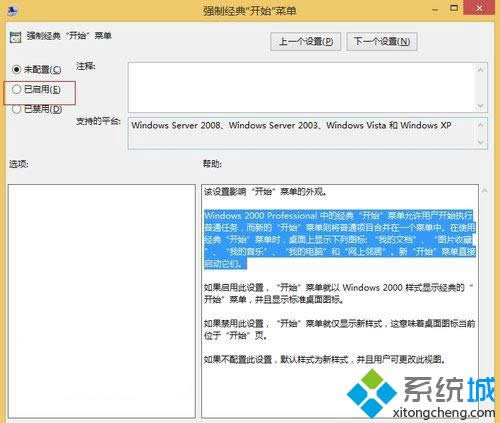 3、找到【强制经典"开始"菜单】,在其属性中勾选“已启用”后点击确定,之后重启电脑就可以生效了。