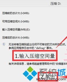 4、输入压缩空间量,然后压缩。压缩空间量等于压缩前的总计大小减去被压缩卷要保留的空间大小,1GB=1024MB;