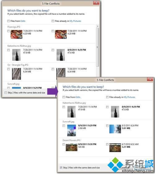 Windows 8是美国微软开发的新一代操作系统,Windows 8共有4个发行版本,分别面向不同用户和设备。于2012年10月26日发布。微软在Windows 8操作系统上对界面做了相当大的调整。取消了经典主题以及Windows 7和Vista的Aero效果,加入了ModernUI,和Windows传统界面并存。同时Windows徽标大幅简化,以反映新的Modern UI风格。前身旗形标志转化成梯形。 的小编这里要为大家带来的是关于盘点微软对Windows8 Beta关键功能改进,相信大家对于win8系统的热情还没有消退,这里推荐大家一款最新win8系统下载!下面一起来看看Windows8 Beta关键功能都有哪些改进吧! 一、在解决文件名冲突时识别重复的文件 在复制或移动文件并遭遇文件名冲突时,Windows8提供了一种全新的体验。如果“选择”对话框中能有一个对比按钮,用以查看两个文件是否相同,那就太好了!通常情况下,两个文件拥有相同的文件名是因为复制操作,在两个完全相同的文件间进行选择是毫无意义的,对于复制操作和移动操作均是如此。Windows 8 Beta中,微软在“详细解决冲突对话框中”新增了一个选项,帮助用户避免不必要的选择,如下图: