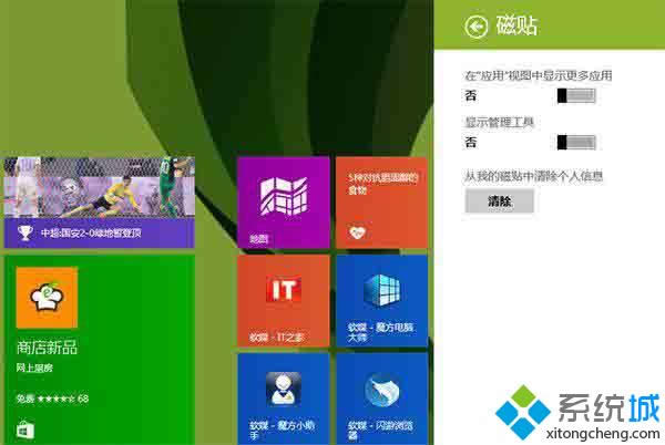 操作方法: 1、打开开始屏幕,使用Win+i组合键(或者将鼠标指向屏幕右下角),调出Charm超级菜单,打开设置,选择磁贴功能;