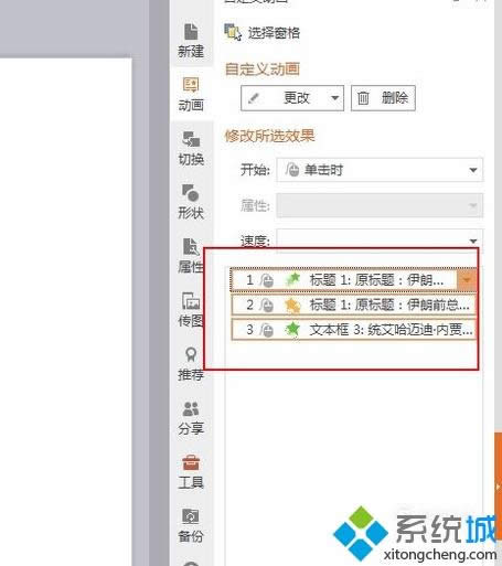3、在弹出的属性菜单中单击“动画”选项,并找到我们需要删除的动画效果。