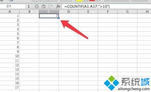 2、假设我们需要统计A列里的数据有多少个数字是大于10的。我们先点击选中C1单元格。