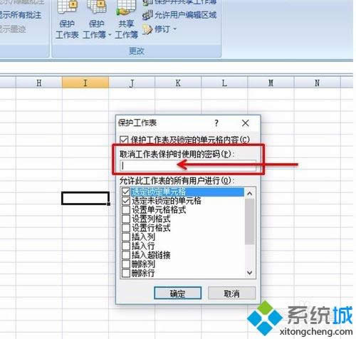4、点击保护工作表后会弹出一个保护工作表的小窗口,如果要设置保护工作表必须先设置取消工作表保护的密码(必填项),如图所示操作。设置好密码后,再在窗口中选择需要保护的项目,默认不打勾的为保护项目,打勾的表示允许所有用户编辑。