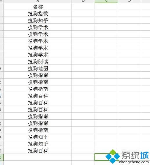 2、打开表格以后,里面有如下的名称。里面的信息存在重复,我们需要查找其中的重复值。
