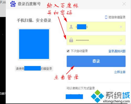 5、点击后会跳出百度帐号的登录框,输入正确的帐号和密码,点击【登录】。