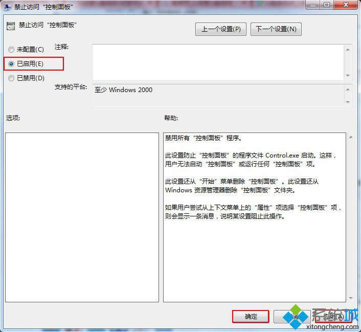 3、在弹出的设置项窗口中选择“已启用”项,按下“应用--确认”按钮,如下图所示: