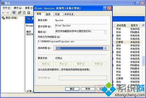 5、双击Print Spooler服务,将“启动类型”改为自动,单击应用按钮,然后再点击启动按钮。现在回到服务界面我们发现,Print Spooler的状态是自动、已启动状态。如下图红框标记所示,