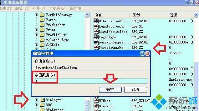 2、依次定位到: HKEY_LOCAL_MACHINE\SOFTWARE\Microsoft\Windows NT\CurrentVersion\Winlogon,双击右边的键值:PowerdownAfterShutdown,将数值数据0改为1(按F5键刷新)即可;