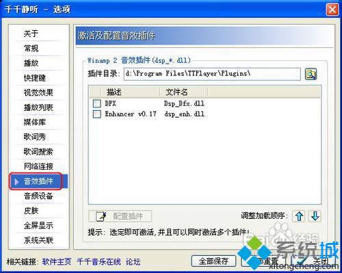 5、在千千静听选项框中, 点击选择(音效插件)。右边框出现音效插件列表等信息。
