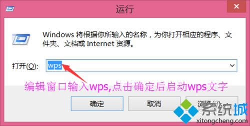 2、在[运行]窗口的打开:位置输入wps,单击确定后即可启动wps文字;
